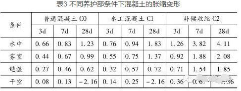 脹縮變形是混凝土的一項(xiàng)重要性質(zhì),不同的濕度條件和水分會(huì)對(duì)混凝土的脹縮變形造成不同的影響。我們通過(guò)不同的養(yǎng)護(hù)條件所造成的結(jié)果不同的現(xiàn)象,來(lái)探究濕度和水分對(duì)混凝土脹縮變形的影響(見(jiàn)表3)。