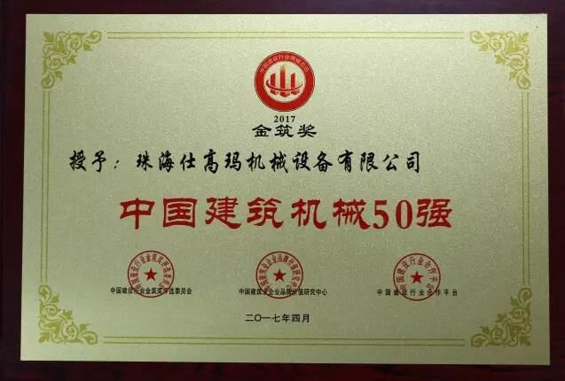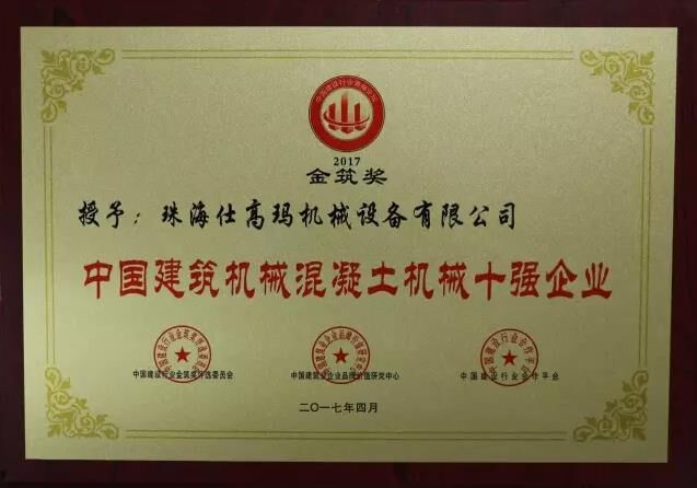近日,“2017中國建設(shè)行業(yè)領(lǐng)袖峰會”暨2016年度“金筑獎”頒獎盛典在北京召開,珠海仕高瑪機(jī)械設(shè)備有限公司在2016年全國建筑業(yè)“金筑獎”評選活動中,榮獲“中國建筑機(jī)械50強(qiáng)”、“中國建筑機(jī)械混凝土機(jī)械十強(qiáng)企業(yè)”稱號。