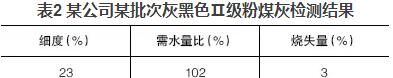 混凝土公司大多數(shù)使用的粉煤灰顏色與水泥相近,多呈灰色;也有部分粉煤灰顏色較深呈灰黑色,這種粉煤灰一般細(xì)度較細(xì)或含碳量較高。但總會(huì)發(fā)現(xiàn)一些深顏色的粉煤灰檢測(cè)結(jié)果與常理不符,如某公司某批次灰黑色Ⅱ級(jí)粉煤灰檢測(cè)結(jié)果見表2。