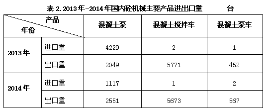 截止到2014年底,中國工程機(jī)械主要產(chǎn)品保有量約為650萬-704萬臺(tái)。其中,混凝土攪拌運(yùn)輸車29.2萬-31.6萬臺(tái),混凝土泵車5.9-6.3萬臺(tái),混凝土泵6.3萬-6.8萬臺(tái),混凝土攪拌站4.7萬-5.2萬臺(tái)。