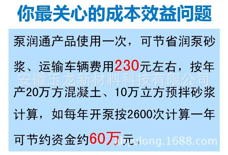 泵潤通產品使用一次,可節(jié)省潤泵砂漿、運輸車輛費用230元左右,按年產20萬方混凝土、10萬立方預拌砂漿計算,如每年開泵按2600次計算一年可節(jié)約資金約60萬元。