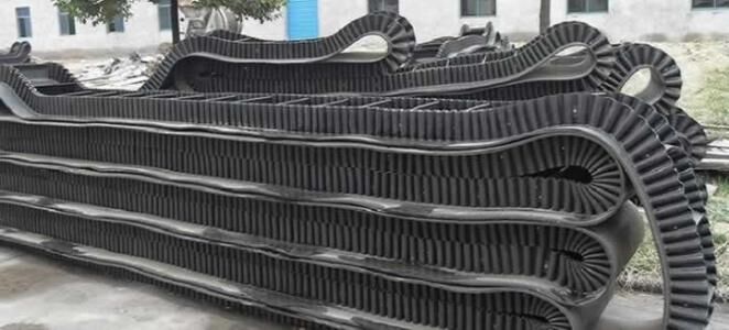 大傾角波狀擋邊帶由基帶、擋邊、橫隔板3部分組成。擋邊起防止物料測滑撒落的作用。為便于繞過滾筒,檔邊設(shè)計(jì)成波紋狀;橫隔板的作用是承托物料,為了實(shí)現(xiàn)大傾角輸送,采用TTC型。檔邊和橫隔板是用二次硫化的方法與基帶連接的,具有很高的連接強(qiáng)度。