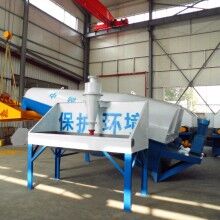 落地式砂石分離機(jī)整套系統(tǒng)主要由:攪拌車加水清洗裝置,溜槽裝置,砂石漿水分離裝置,和泥漿水后處理裝置組成?;炷凛斔驮O(shè)備清洗后,將殘余混凝土排入溜槽中,在高壓水流沖擊下,經(jīng)溜槽進(jìn)入砂石分離機(jī),在不斷旋轉(zhuǎn)的分離機(jī)作用下,對(duì)混凝土進(jìn)行充分的清洗,同時(shí)將砂石、漿水進(jìn)行分離,分離后的砂、石在導(dǎo)料葉片的作用下背向流動(dòng)至出料口排出分離機(jī)落入振動(dòng)篩分機(jī),通過(guò)篩分將沙、石子分開,分別堆放。清洗后的漿水從分離機(jī)的溢水口排出進(jìn)入濃漿池,經(jīng)污水泵加壓打到旋流器除去多余固體微粒,降低漿水濃度,進(jìn)入攪拌池回收利用。進(jìn)入攪拌池的漿水為了防止沉淀凝固,需通過(guò)攪拌器的作用,攪拌器的工作為間歇式。分離出水泥漿在連續(xù)的攪拌器作用下,再通過(guò)高壓污水泵輸送到攪拌樓中待生產(chǎn)再利用。整個(gè)控制系統(tǒng)設(shè)有手動(dòng)和自動(dòng)控制,方便控制設(shè)置,整個(gè)系統(tǒng)運(yùn)行可靠,故障率低,維護(hù)量少等特點(diǎn)。